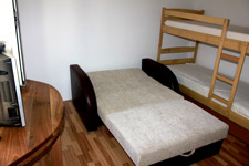Wohnbereich: 1 Zimmer mit Doppelbett, Kombi-Küche, Waschmaschine, Sofa